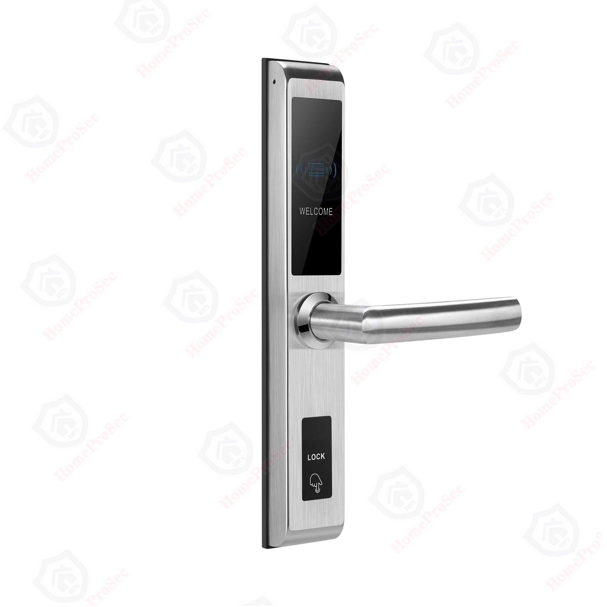 Khóa thẻ từ cửa nhôm HomeProSec HPS- 958★ Phù hợp với: Khóa cửa chung cư, Homestay, Khách sạn, căn hộ, Nhà phố, Nhà riêng, tòa nhà…★ Mở khóa bằng: Thẻ từ Mifare, chìa cơ★ Loại cửa phù hợp: Khóa vân tay cửa nhôm, Cửa gỗ, cửa thép, cửa chống cháy, cửa sắt, cửa mở bản lề, 1 cánh, 2 cánh, 4 cánh…..★ Chế độ quản lý: quản lý độc lập (thẻ Mifare từng phòng), Quản lý tập trung ( thẻ Mifare- kèm với bộ giải mã)★ Chủ nhà tự động: thêm, xóa thẻ từng người thoải mái, dễ dàng, chính xác, nhanh chóng. Giới hạn thời gian sử dụng thẻ tùy ý.★ Màu sắc: Bạc★ Chất liệu: Thép không gỉ/ Inox 304★ Đố cửa dày phù hợp: 38 – 80 mm★ Kích cỡ khóa: L300mm * W50mm★ Chìa cơ: 2 chìa/khóa, sử dụng trong trường hợp mở cửa khẩn cấp★ Đố khóa: chuẩn châu âu (2885/ 3085/ 3585/ 4085/ 4585)★ Pin: 4 viên AA (mở khóa 16.000 lần) ★ Video dự án thực tế: